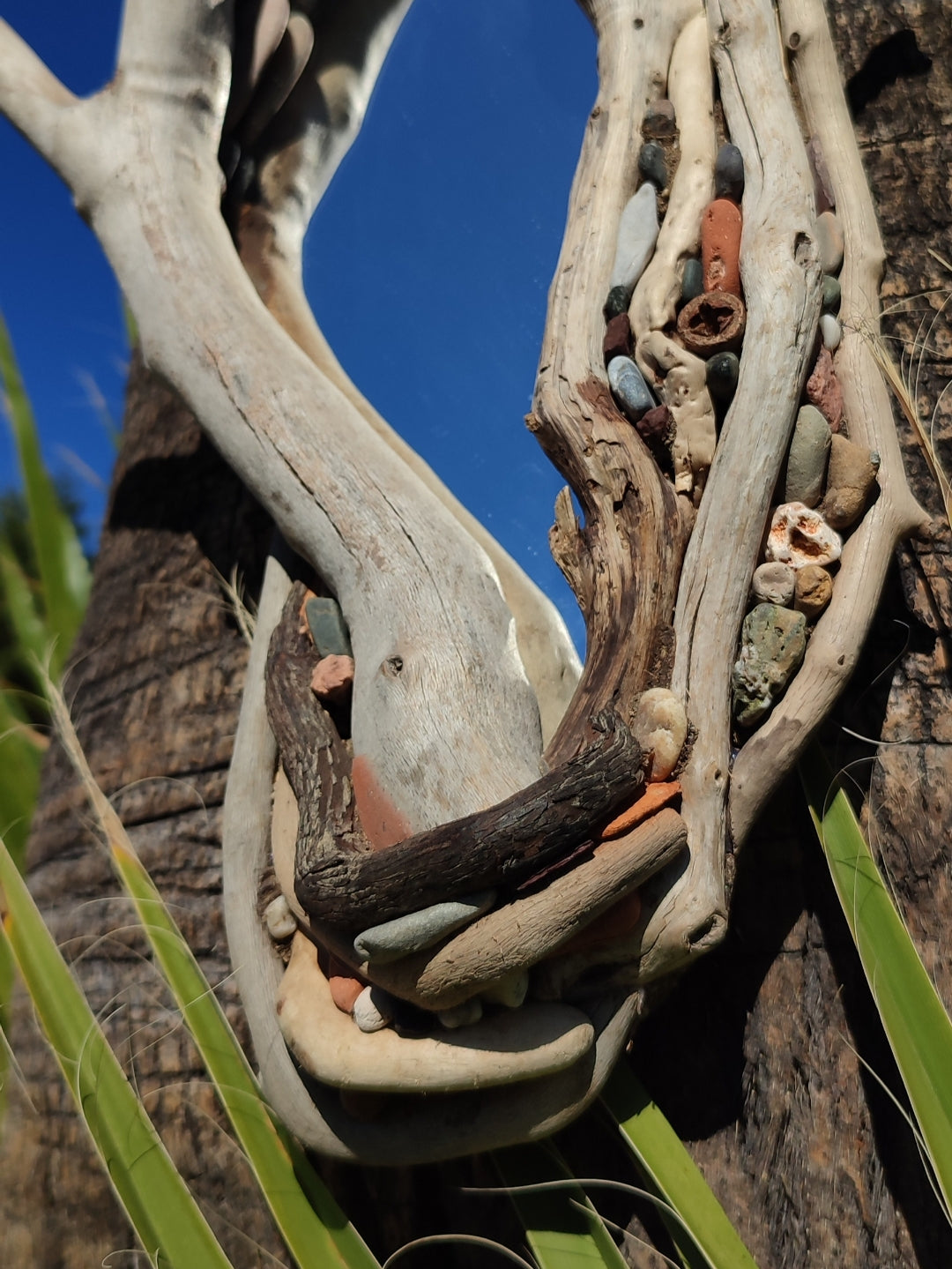 Driftwood gathered along the shore, shaped by salt, sun, and time, becomes the frame for a new reflection. Every branch, knot, and pebble is chosen not for perfection, but for the story it carries — the quiet rhythm of nature’s design.