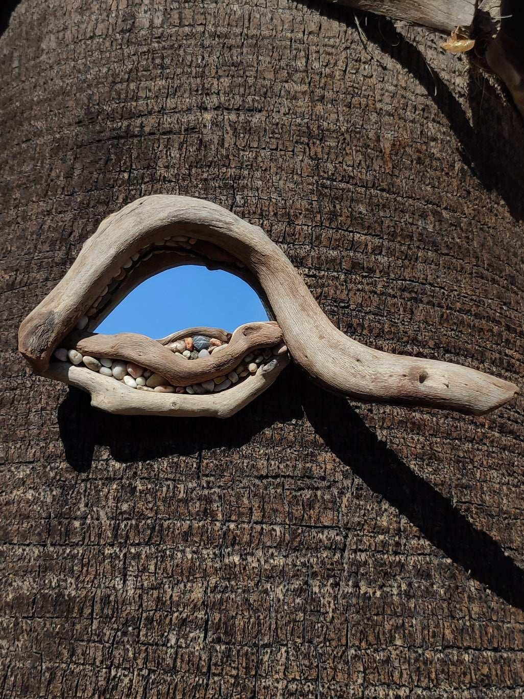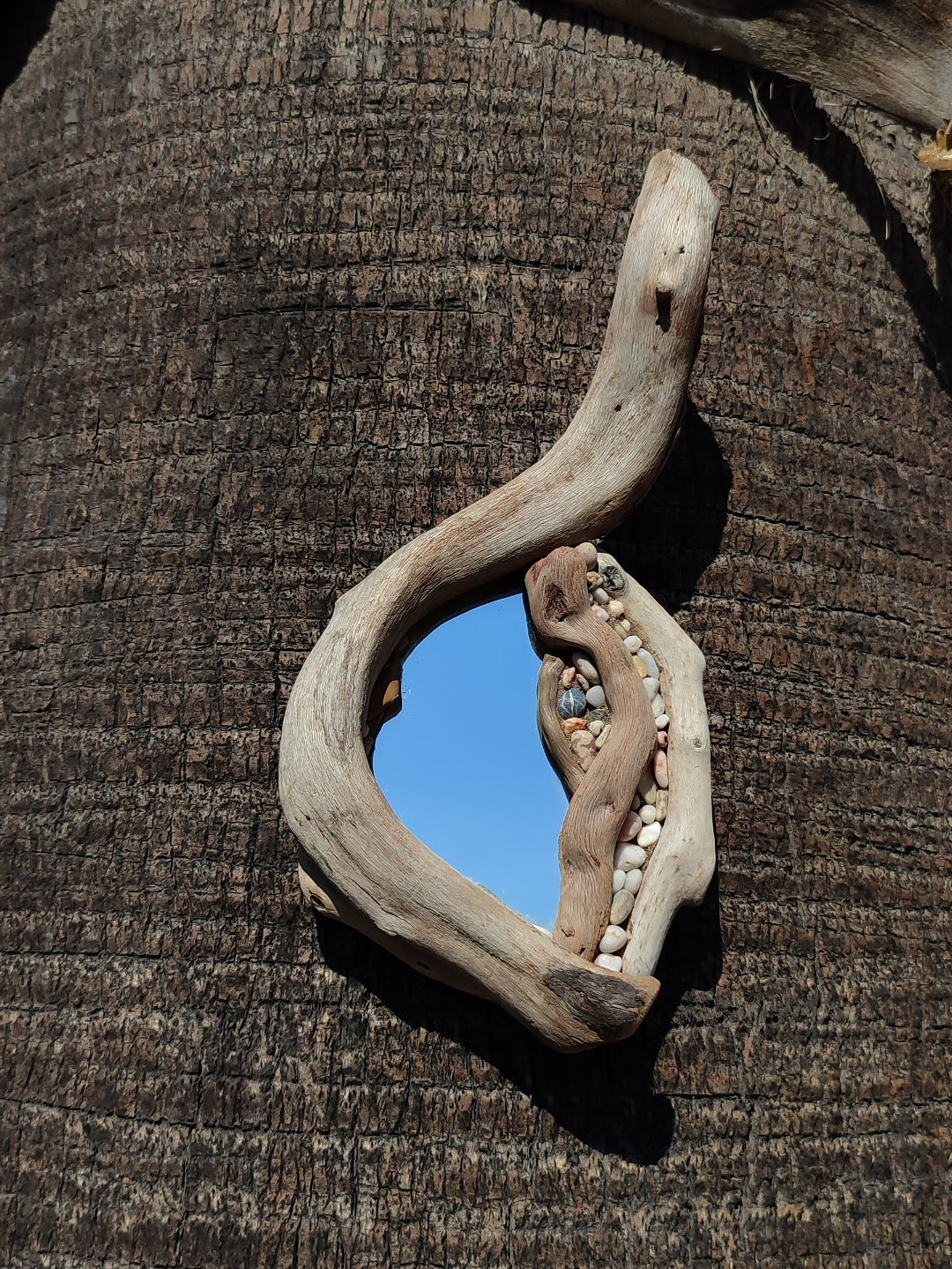 This small Phalaena mirror is sculpted from driftwood and sea-worn pebbles, collected along the shores of Crete. Each curve of wood follows its natural rhythm, forming a soft, flowing frame that feels alive.
