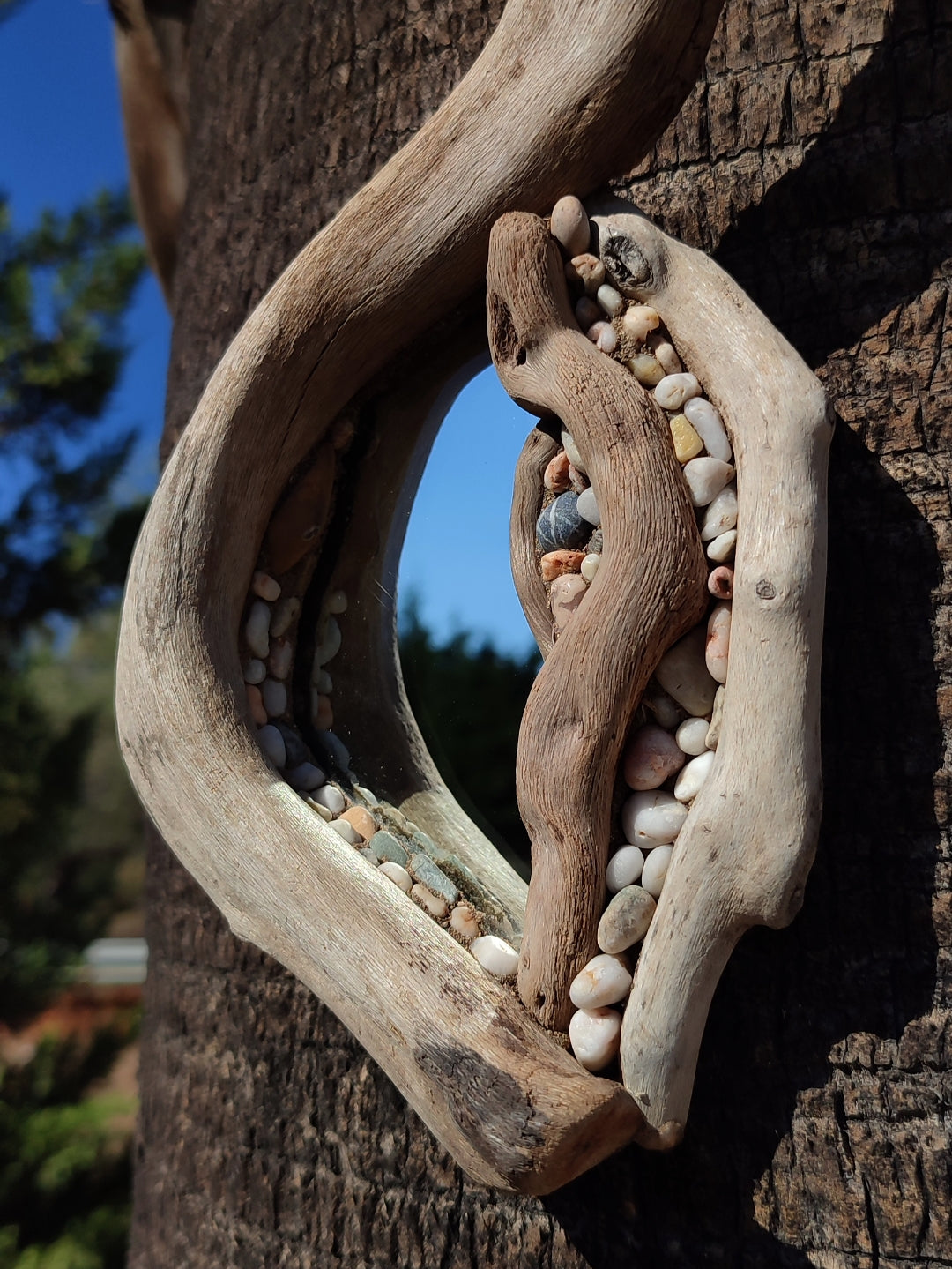 Handmade Driftwood Mirror with White Sea Pebbles